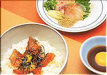 熱いごはんに(2)を形良く盛り、のりを天盛りにし、タレをかけて食する。