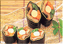(1) アナゴはぬめりを軽く取り除き、背開きにして骨をとる。 (2) 素焼きにして、【A】のたれをつけながら2〜3回くり返して焼く。 (3) にんじん、いんげんは塩ゆでにしておく。 (4) 卵は板のりの大きさに薄焼きにする。 (5) 巻きすの上に板のり、(4)をのせて、(2)、(3)、チーズを置き巻く。 |