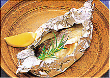 アルミホイルの上に5mm位の輪切りのたまねぎを敷き、スズキをのせる。好みの香草とバターを入れて包んで、フライパンにのせて焼く。
