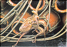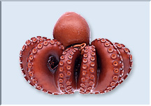 タコは頭足類八腕目の軟体動物で、東北地方から四国、九州にいたる各地の浅い海の岩礁に生息しています。頭のように見える丸い部分が胴で、この中に内臓が入っています。胴と足の間の目のある部分が頭で、大きいもので全長60cmくらいまで成長します。 タコは夜行性でエビ、カ ニ、貝、魚などを巣穴や手近な穴で食べます。