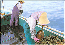 この漁は500m余りのロープに約50個のタコ壺をつけたものを、15〜16本ほど海に仕掛けて、タコ壺にもぐりこんだタコを捕らえるものです。通常は投入後一日おいてローラーで引き上げます。夜行性でカニ、エビ等を好み、餌は巣穴や手近な穴で食べる、というタコの習性を利用した漁法です。