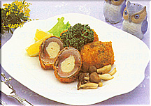 (1) アジをおろして、塩、こしょうをする。 (2) 【A】を混ぜ合わせマッシュポテトを作る。 (3) (2)と【B】を合わせて味を確かめて俵型にまとめる。 (4) (1)も汁気をふきとり、(3)を中央において巻き(楊子でとめても良い)、小麦粉、とき卵、パン粉の順につけてなじませる。 (5) (4)をからっと揚げる。 (6) しめじの根元を切り落とし、さばいてバターソテーする。 (7) (5)と(6)、レモン、パセリを盛り合わす。 |