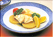 鯛の切り身4個(400g)、タマネギ(中2個)、にんにく(2かけ)、バター(20g)、サラダ油(大さじ1)、レモン(1/2個)、塩こしょう少々