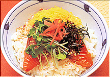 丼にご飯を入れ、ブリ刺身をのせ、タレをかけ、(1)、(2)、きざみのり、紅しょうが、ごまを盛る。