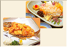 《刺身》 (1) ひらめは包丁の先でうろこをこそげとる。 (2) えらを除き裏側(皮の白い方)の腹に切り目を入れて、わたを出し、手早く水洗いする。 (3) ふきんで水気を拭き、観音開きにし五枚おろしにする。 (4) 四枚の皮を取り、うす作りにする。 《から揚げ》 (1) ひらめは五枚におろし、塩、こしょう、片栗粉をうすくまぶして、180℃に熱した揚げ油に入れてゆっくり中火でカラッと揚げる。(最後は強火にして油切れをよくする。) (2) (1)のひらめを和紙を敷いた器に盛り、京ネギは白髪ネギ、青ネギは小口切り、おろし大根を添える。 (3) 好みのたれで刺身、から揚げとも食べる。 |